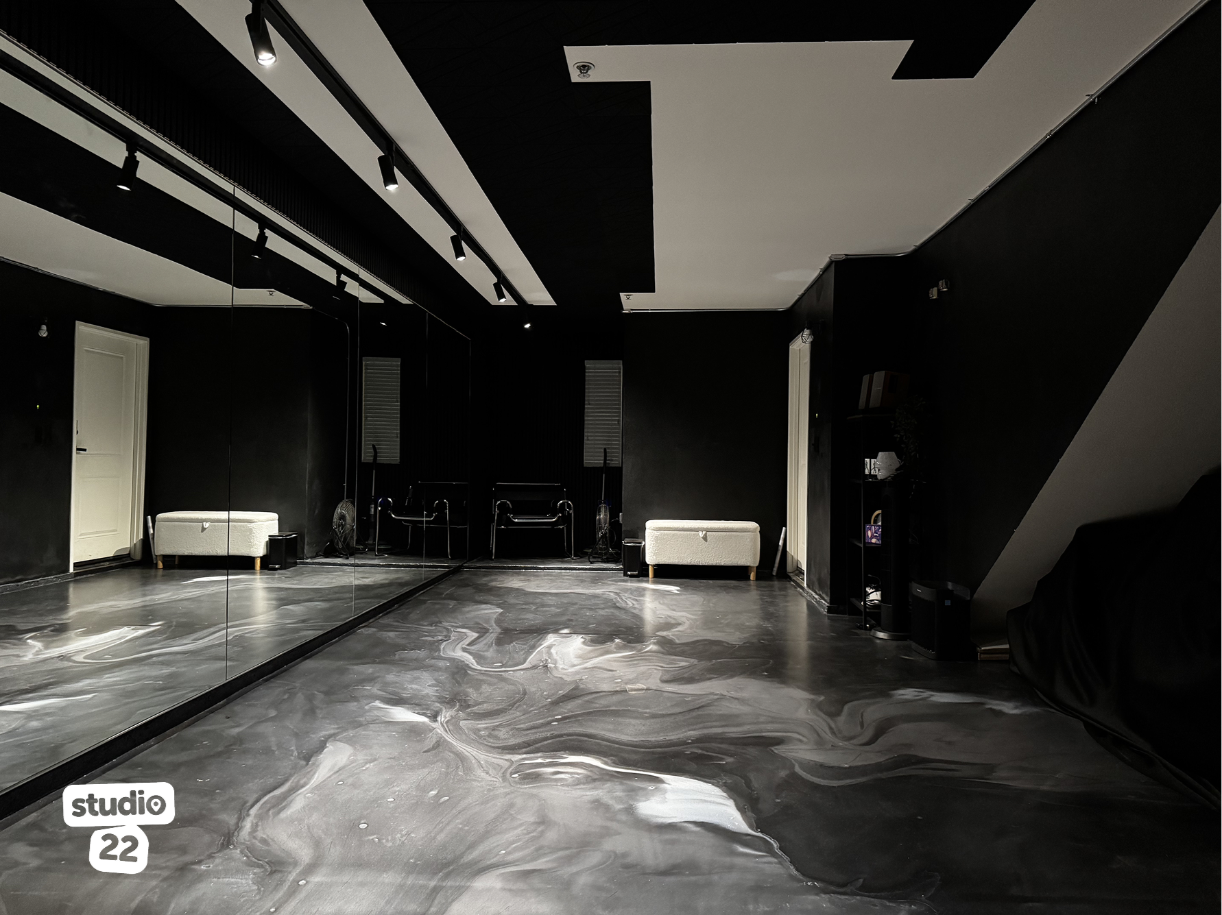 The studio includes essential amenities to support your session, including:- 20 ft x 7 ft mirrors